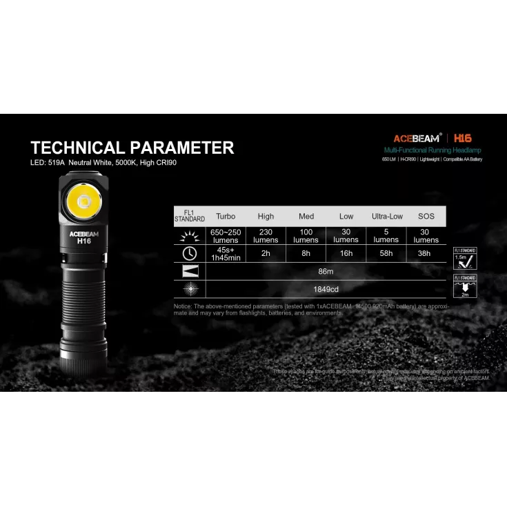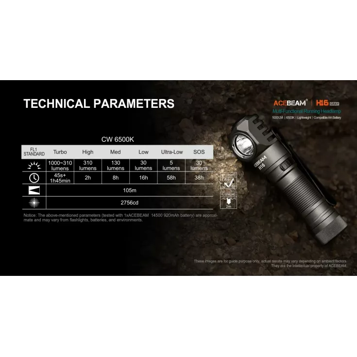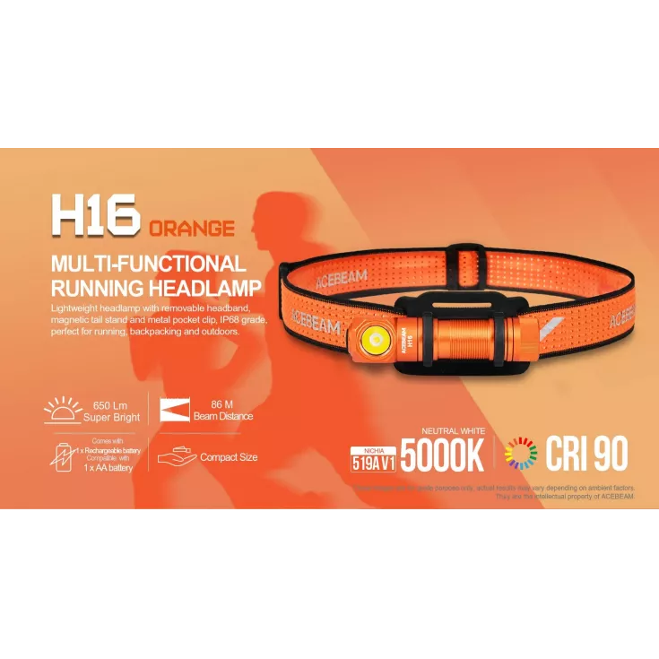 The Acebeam H16 headlamp has a maximum output of 1000 lumens from the cool white 6500K LED and 650 lumens from the 519A neutral white 5000K LED. The light is powered by 1 x 14500 li-ion battery or 1 x AA (alkaline or NiMH). A 920mAh 14500 li-ion is included with a built-in type-C port for direct charging into the cell, removing the need for a separate external charger.
