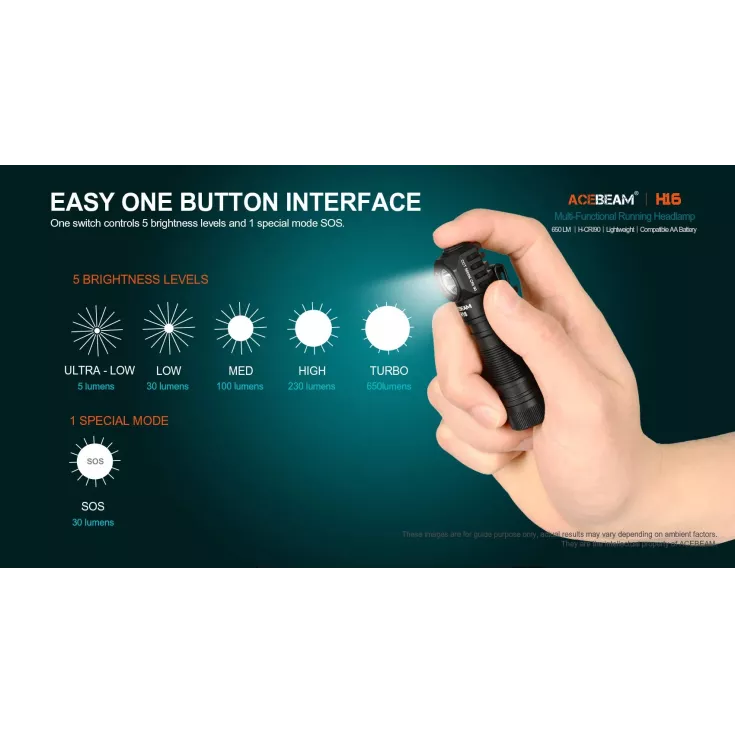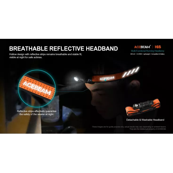 The H16 offers five brightness levels and an SOS mode, all of which are operated by the single switch on the top of the light. The flashlight has a 100° wide range flood beam and a choice of 5000K neutral (black or orange headlamp) or 6500K cool white (grey headlamp) beam temperature.