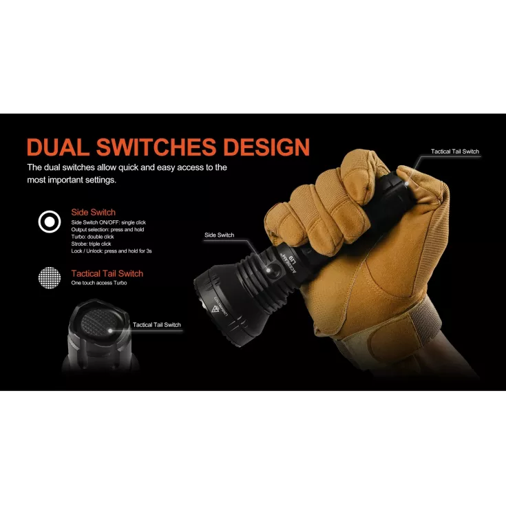 Offering an impressive maximum beam distance of 1083 meters, the L19 is an ideal light for applications that require a long throw, such as search and rescue. The flashlight has six brightness levels plus a Strobe mode, all of which are operated by a dual switch system, made up of a tail and side switch.