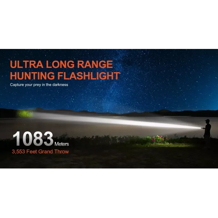 Maximum beam distance 1083 meters, waterproof to IP68 and resistant to impacts up to 1 meter.