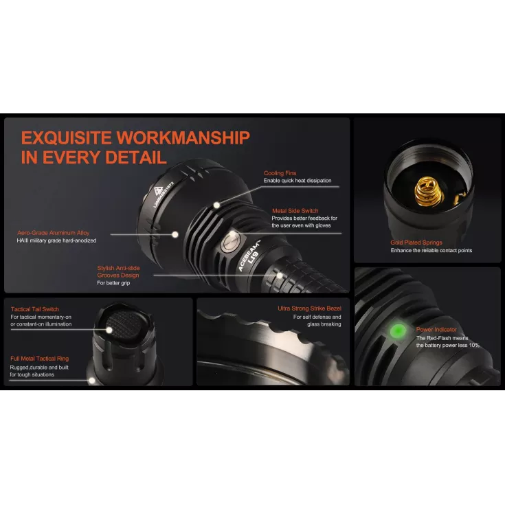 The Acebeam L19 features cooling fins to enable quick heat dissipation, anti-slide grooves design for better grip, a crenulated steel bezek for emergency use and a power indicator so you know when it’s time to recharge.