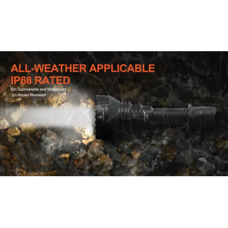 The Acebeam L19 V2.0 flashlight has a maximum output of 2200 lumens from the SFT40 HI LED and is powered by 1 x 21700 5100mAh protected battery (included). The battery has a built-in USB-C port for efficient and simple recharging with the included cable.