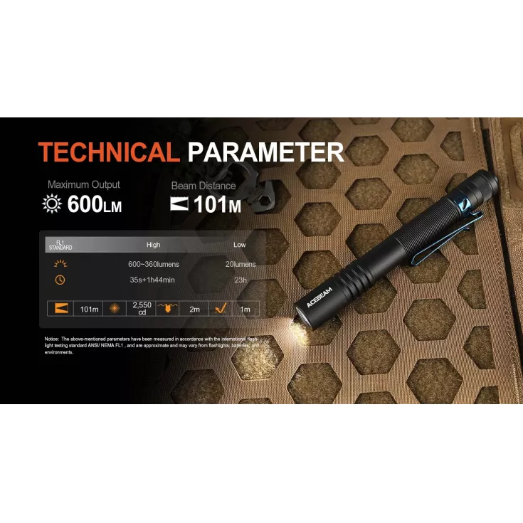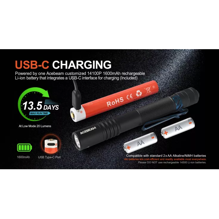 Powered by included 14100 3.7V 1600mAh Acebeam customized Lithium-ion battery