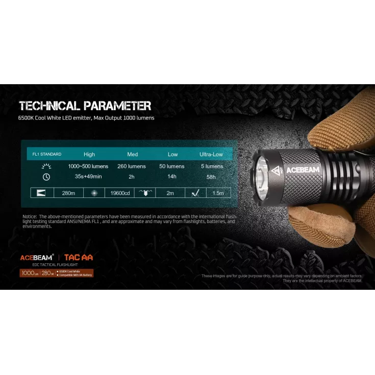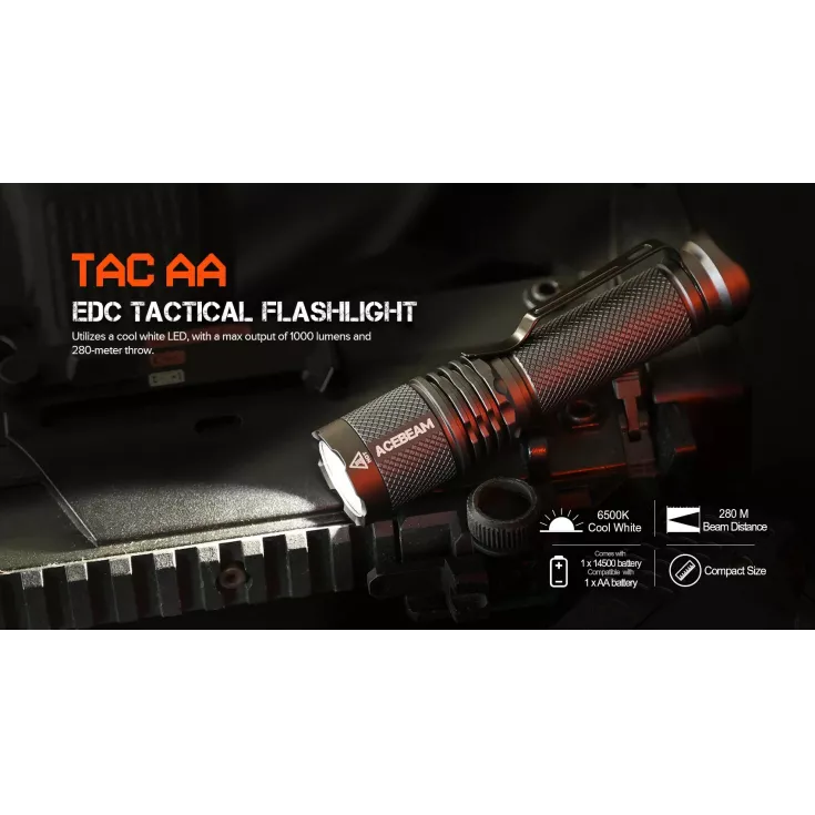 The Acebeam TAC AA torch has a maximum output of 1000 lumens from the 6500K cool white LED or 750 lumens from the high CRI 5000K neutral white LED. The light is powered by 1 x included 14500 li-ion battery but can also use a single AA (alkaline or NiMH). The battery that comes with the TAC AA has a built-in USB-C port for direct charging into the cell, removing the need for a separate external charger.