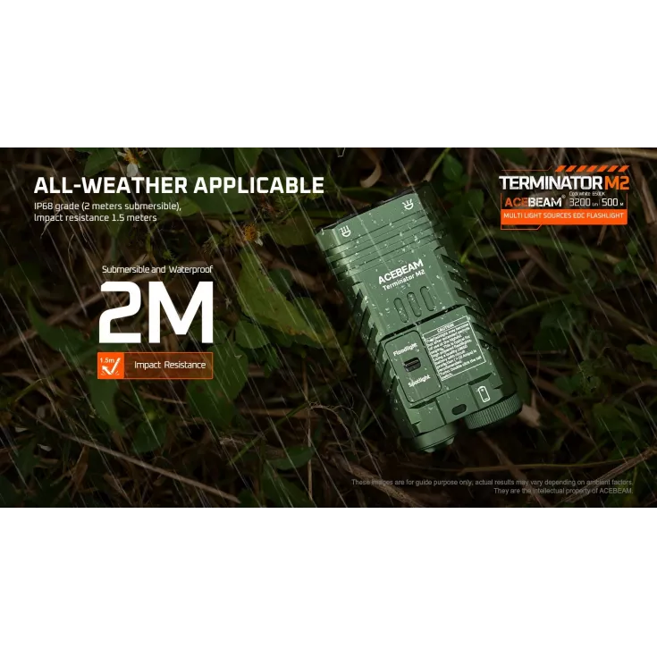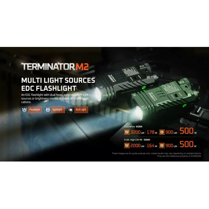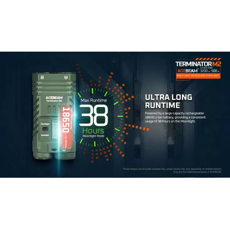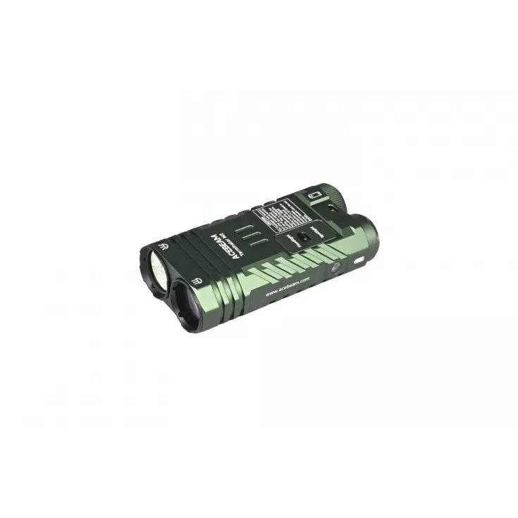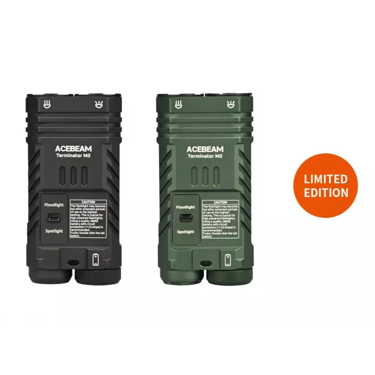 The Acebeam Terminator M2 torch has a maximum output of 3200 lumens from the cool white 6500K LED and 2000 lumens from the neutral white 5000K CRI90 LED. The light is powered by 1 x 18650 li-ion battery and the included cell has a built-in USB Type-C port for direct recharging into the battery, removing the need for a separate external charger.