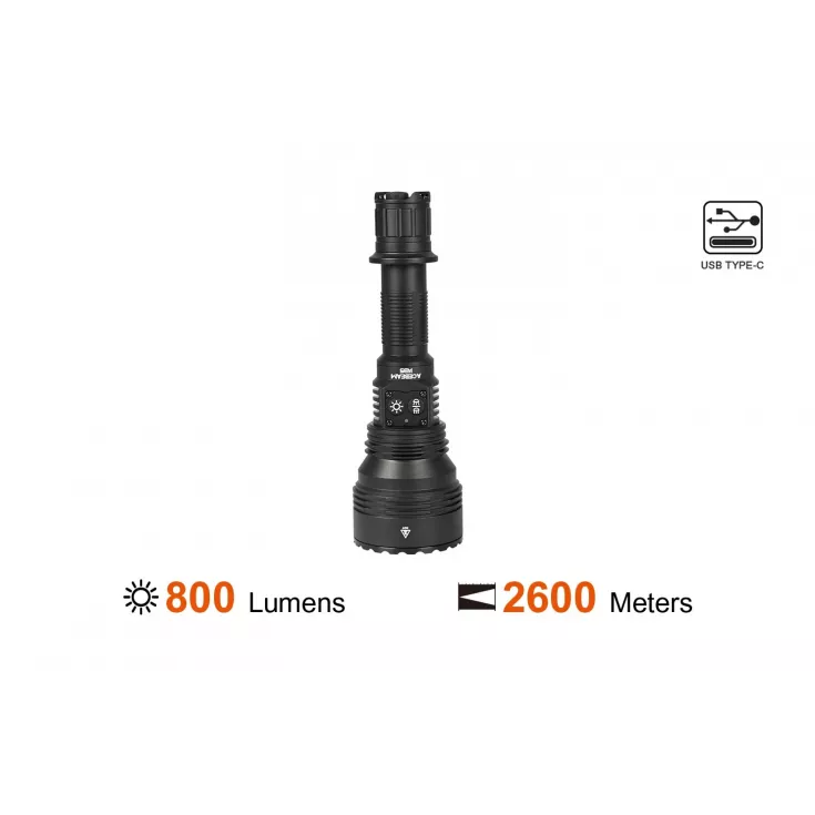 Turbo: 800~470 lumens – 6 mins + 1 hr 40 mins runtime – 2600 meters