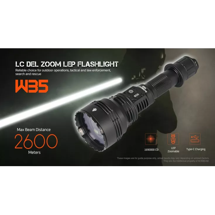 The Acebeam W35 is the first LC Del Zoom (Liquid Crystal Diffractive Electro-Optic Lens) LEP flashlight available, powered by 1x Acebeam 21700 Battery to produce a maximum brightness of 800 lumens at up to 2600 metres.