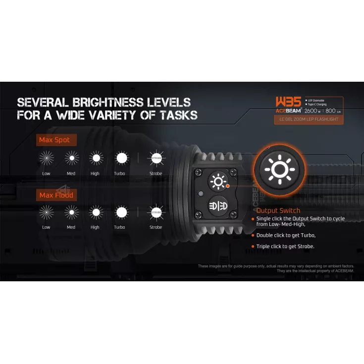 The W35 has an electronic controlled zoom to change the narrow spotlight to large floodlight as well as producing several brightness levels including Low, Medium, and High generated by a single click on the output switch, Turbo generated by a double click and Strobe by a triple click.
