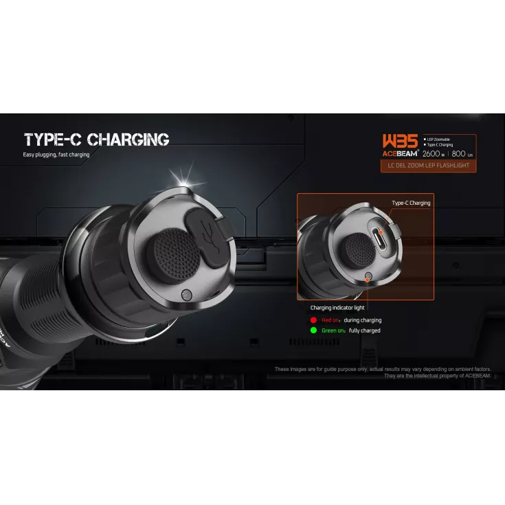 Charged by a USB-C charging point found on the tail cap, the fast speed charging mechanism can be monitored by the red light indicating that charging is in progress and a green light indicating the W35 is fully charged.