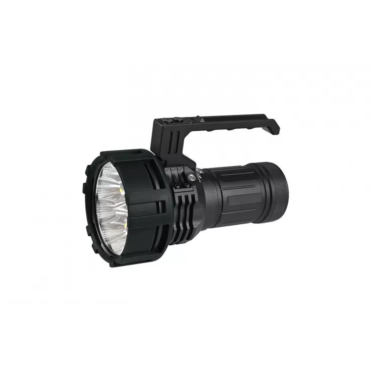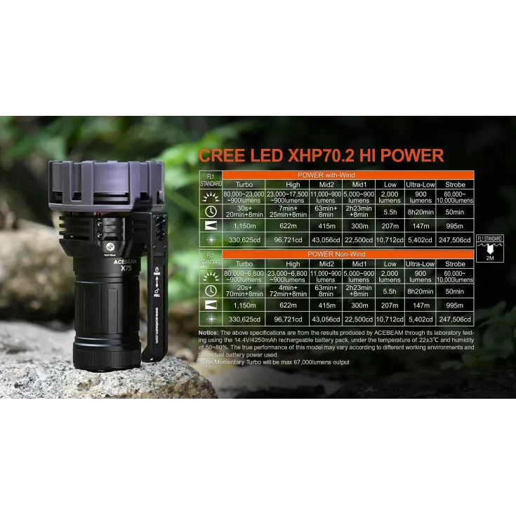 The Acebeam X75 flashlight has an astounding output of 80,000 lumens from the 12 x XHP70.2 6500K LEDs and is powered by a built-in battery pack made up of 4 x 21700 li-ion cells.