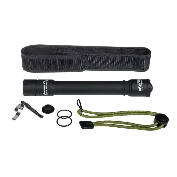Featuring a long, slim body, the Partner C4 is extremely lightweight and comfortable to hold. In addition, the TIR optics ensure the smooth beam is not affected after continous use. The flashlight comes with a holster for secure storage and carry.