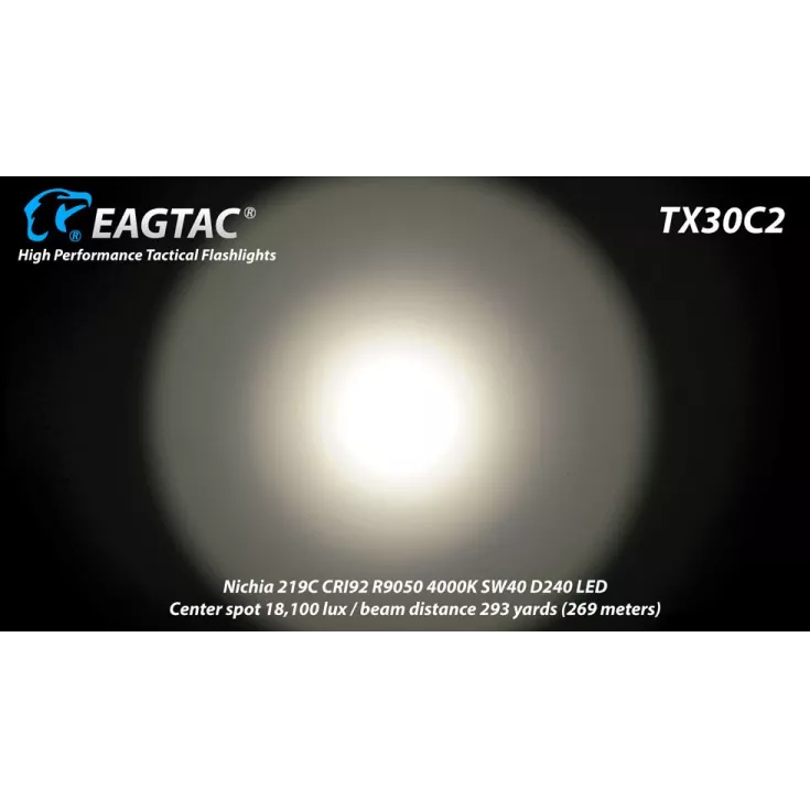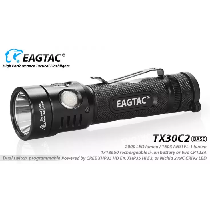 The Eagletac TX30C2 torch has a maximum output of 1603 lumens from the Cree XHP35 HD E4 LED or approximately 7% less from the Cree Nichia 219C LED. The flashlight is powered by either 1 x 18650 Li-ion batteries or 2 x CR123 single use cells. Please note, the Kit version comes with a body tube and can take 2 x 18650 batteries, however it cannot take 4 x CR123 single use cells.