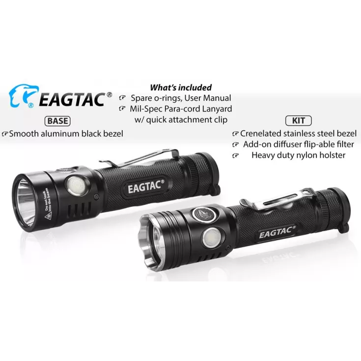Kit Version Includes: spare o-rings, lanyard, crenulated stainless steel bezel, diffuser, nylon holster, body extender tube, 2 x CR123 single use batteries.