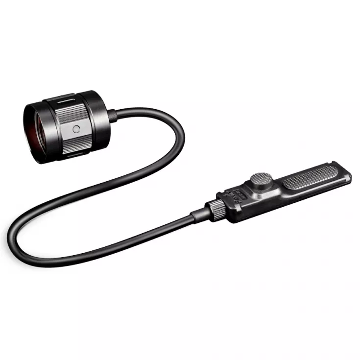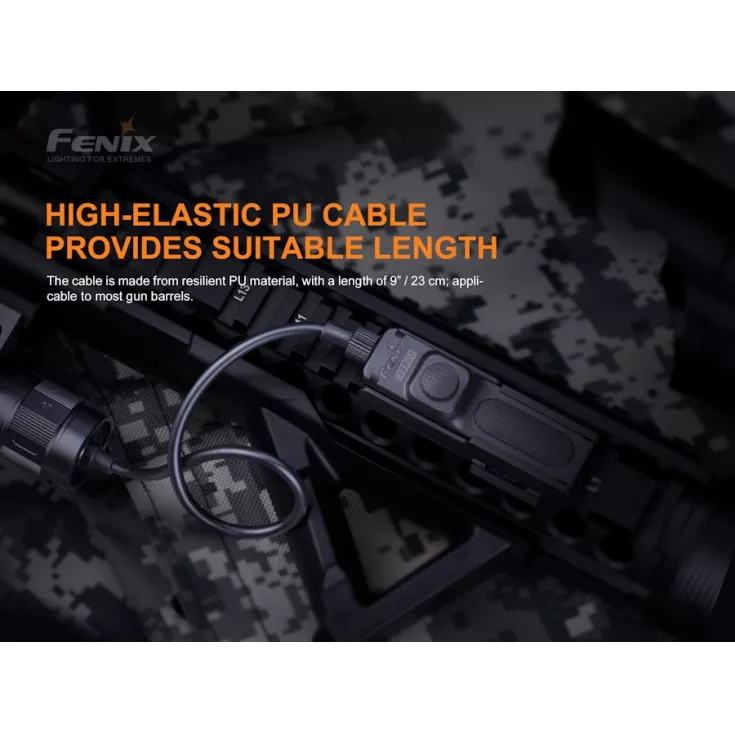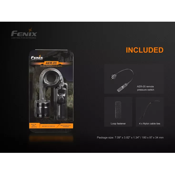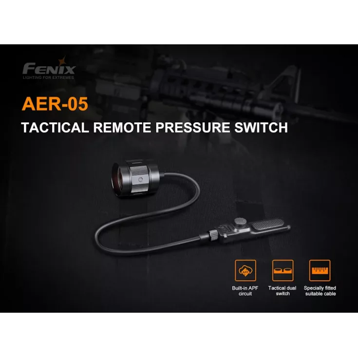 The Fenix AER-05 remote switch is designed for tactical use. It features a 30 mm pressure pad with a tactical push button switch for both momentary and constant on, plus a separate noiseless pressure pad switch for strobe function.