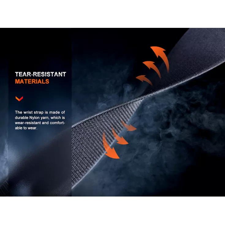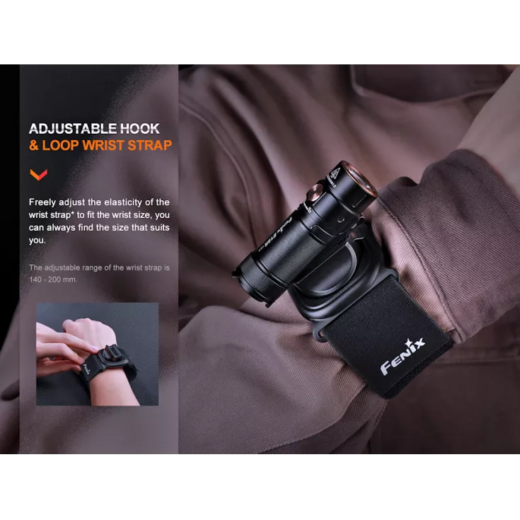 The flashlight holder can be worn on the side or top of the wrist and is compatible with the following Fenix torches: E12 V2, E16, E18R V2, LD12, LD22 V2, E35 V3, PD25R V2, PD32, PD35 and PD36 series LED torches.