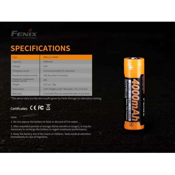 The Fenix ARB-L21-4000P li-ion battery is a spare or replacement cell for the Fenix LR35R flashlight. It features a built-in circuit for protection against over-charging, over-discharging and over-heating.