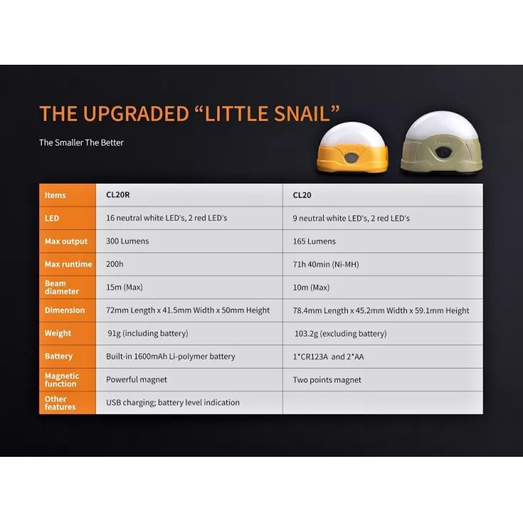 The Fenix CL20R is a rechargeable version of the popular CL20 camping light. The CL20R has a maximum output of 300 lumens from the 16 premium neutral white LEDs, in addition to red light from 2 red LEDs. The light is powered by a built-in, Li-polymer battery which is rechargeable via a micro USB port.