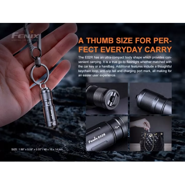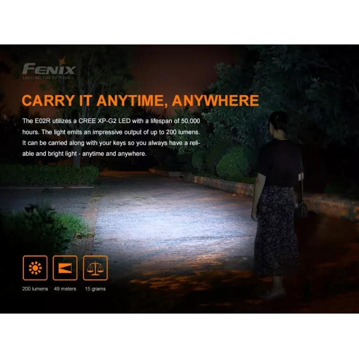 The Fenix E02R is a high performance, rechargeable keyring light that is the perfect addition to your keys, bag or pocket. Ideal for everyday carry, the small torch offers two brightness levels, with a maximum output of 200 lumens from the Cree XP-G2 S3 LED.