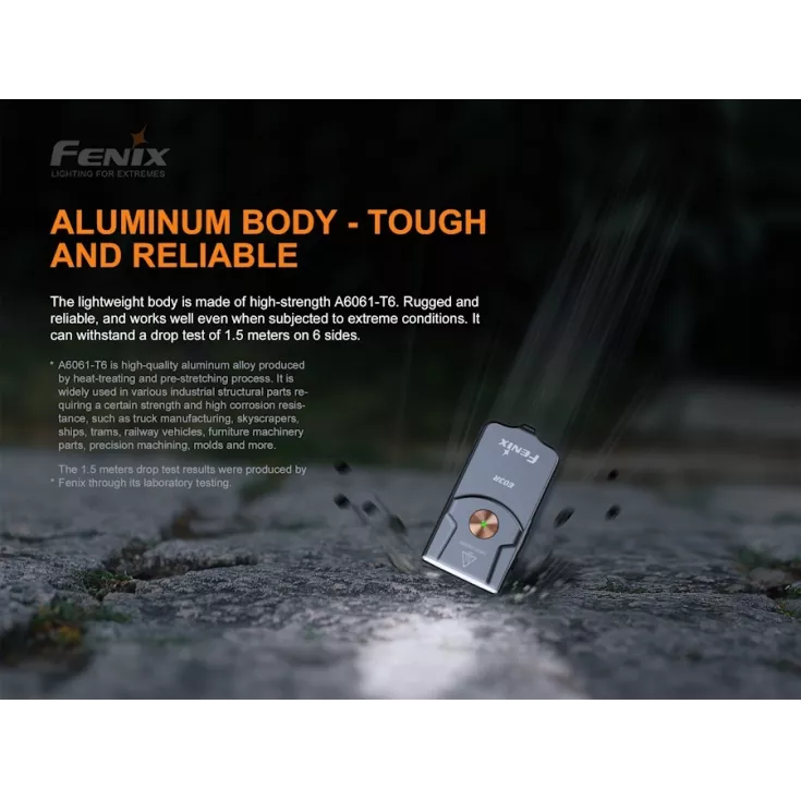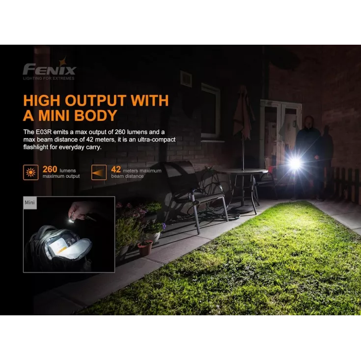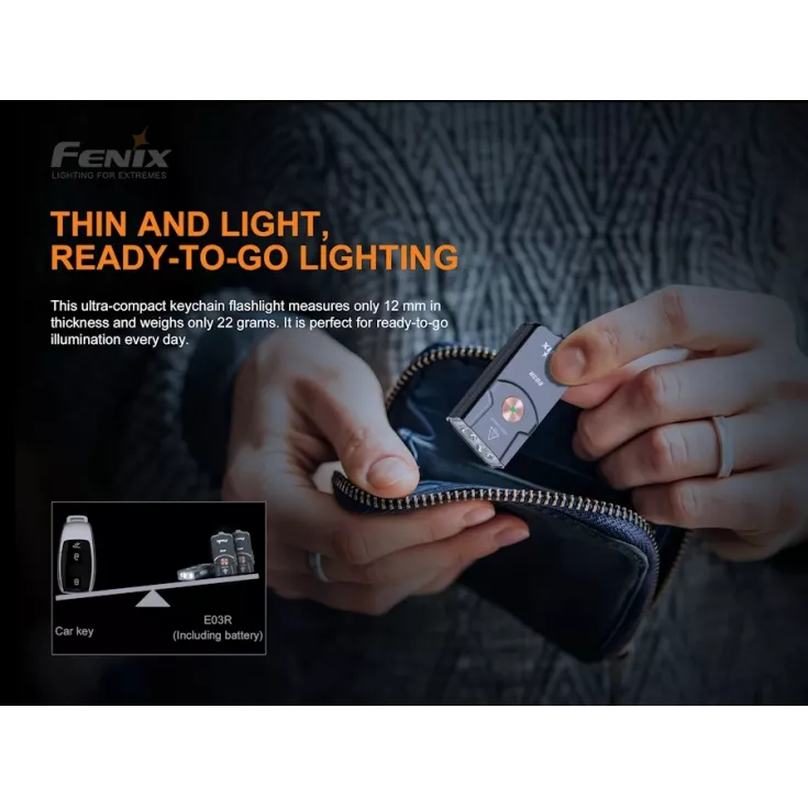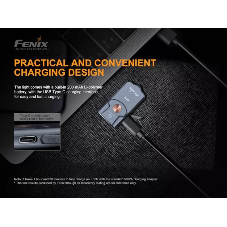 Fenix E03R Includes: Built-in lithium polymer battery, USB-C charging cable and key chain.