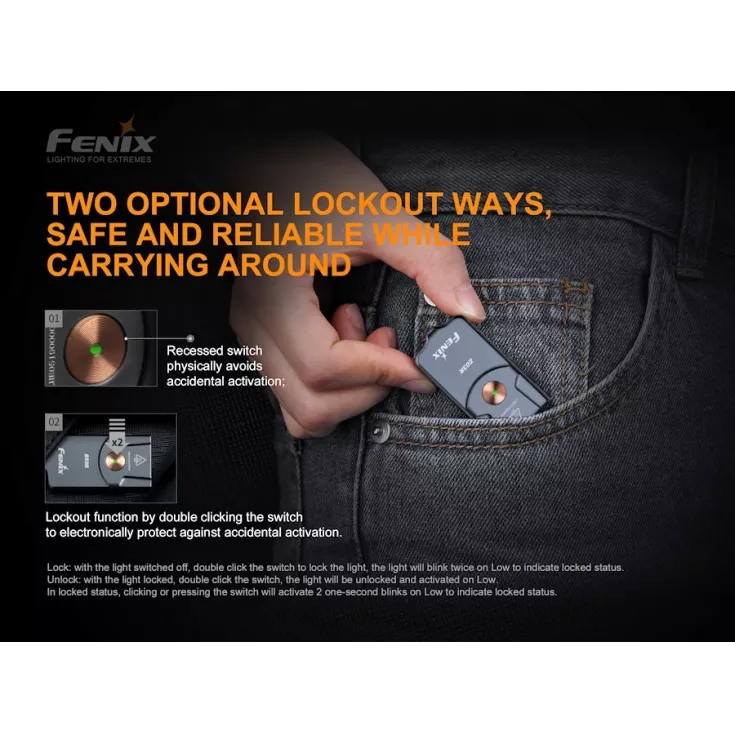 The keyring torch is operated using a single side switch, providing access to the four white brightness levels and two red modes. To avoid accidental activation, the switch is recessed or for extra peace of mind, double click the switch to enter lockout mode.
