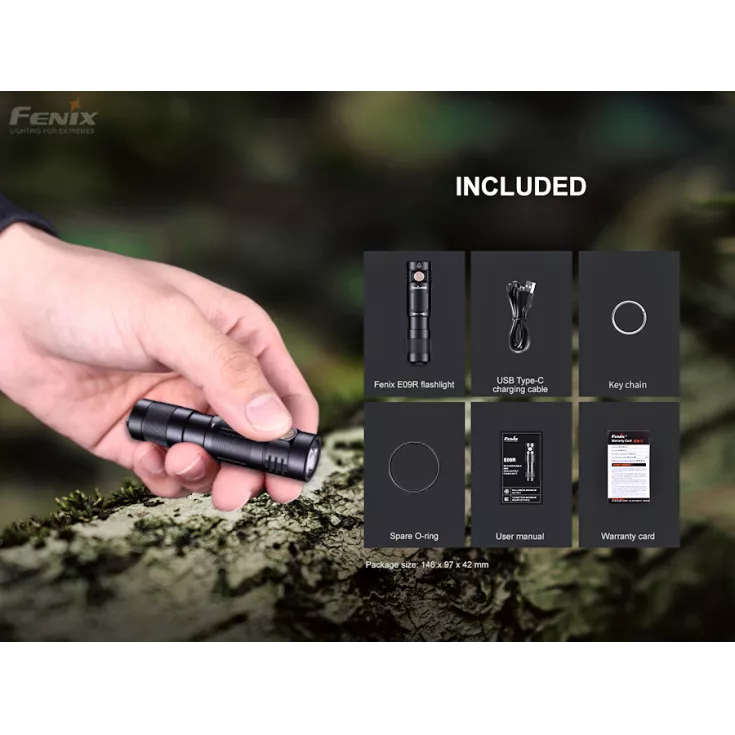 Fenix EO9R Includes: USB-C Type-C charging cable, key chain ring and spare o-ring.
