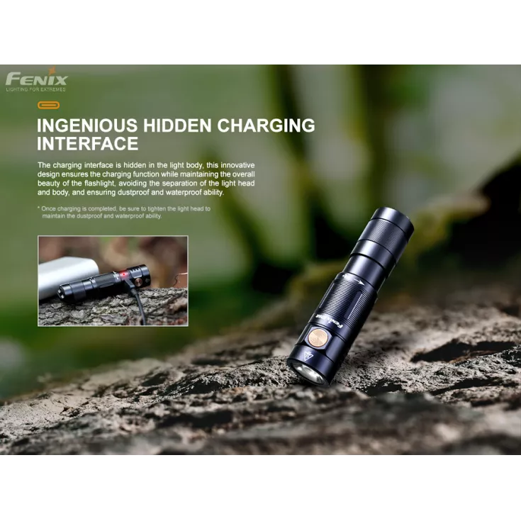 The E09R is rechargeable via USB-C (cable included) and features an ingenious hidden charging port, which is revealed by unscrewing the cover on the middle section of the torch. The light can also be used while being charged, making is a useful camping light when used in combination with a power bank.