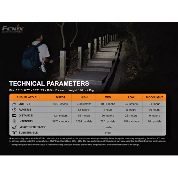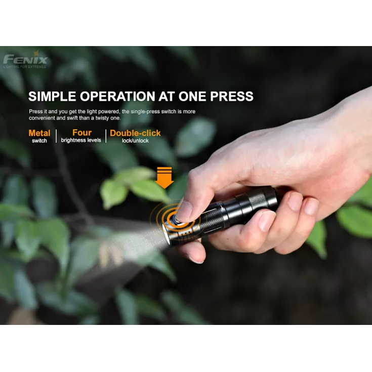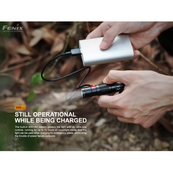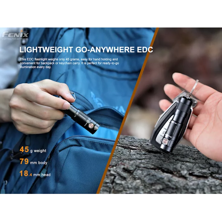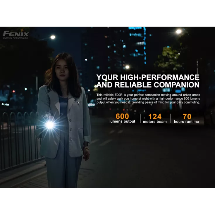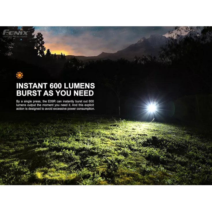 The Fenix E09R is a compact thumb-sized rechargeable LED torch with a built-in 800mAh Li-polymer battery. Weighing just 45 grams and measuring 79mm long, the E09R can easily be carried in a pocket or attached to a set of keys with the supplied split ring.