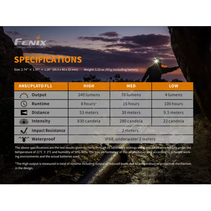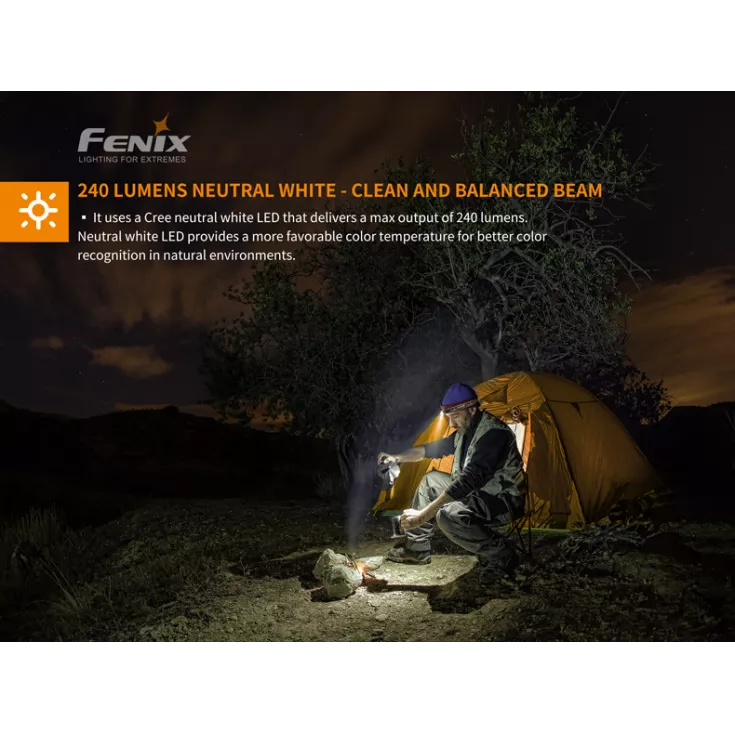 The Fenix HM23 head torch offers a maximum output of 240 lumens and is powered by 1 x AA battery (alkaline or NiMH). Lightweight and compact, the headlamp is the ideal companion for trail running, hiking and camping expeditions.