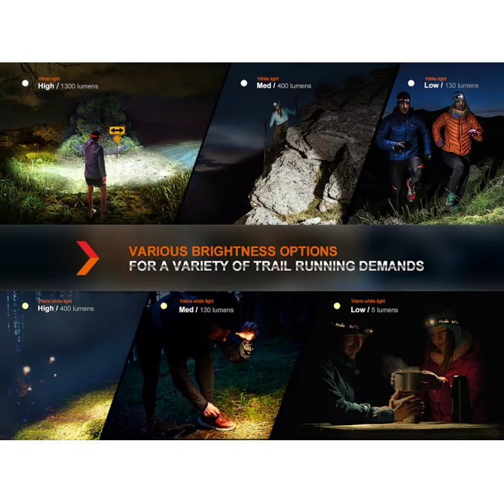 The Fenix HM65R-DT trail running rechargeable headlight has a maximum output of 1500 lumens from the Luminus SST40 white and SST20 warm white LED’s and is powered by a single 18650 battery (included).