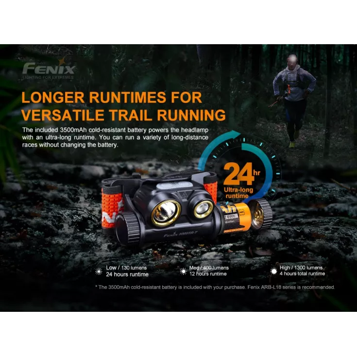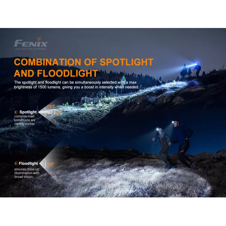 The Fenix HM65R-T is a high performance trail running headlamp, based on the best selling HM65R head torch. As with the HM65R, the T version features dual LEDs providing both a spotlight and floodlight. The two modes are operated by their own switches on top of the light and can be activated together or independently to provide the right output for you.