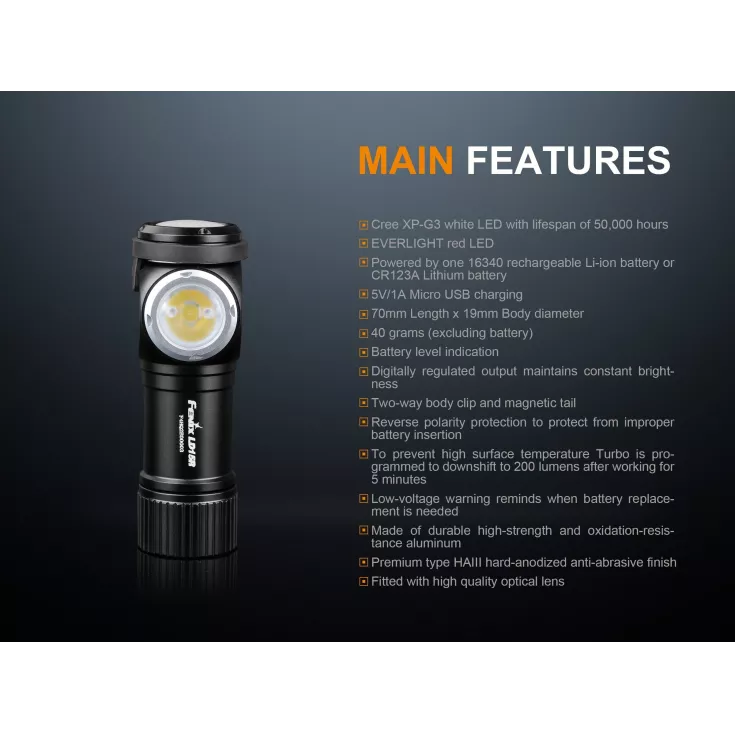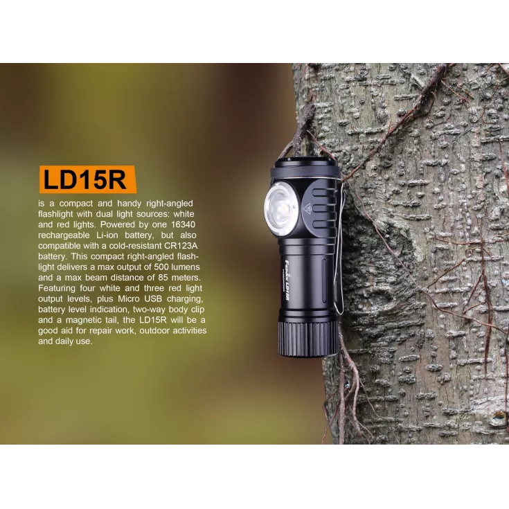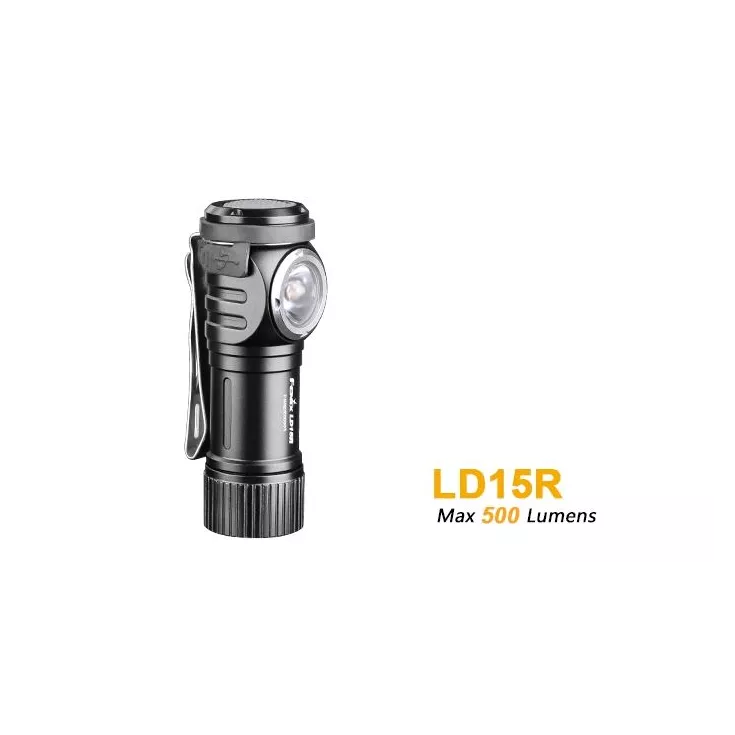 The Fenix LD15R torch has a maximum output of 500 lumens from the Cree XP-G3 LED and can be powered by either 1 x Li-ion RCR123A (16340) battery or 1 x single use CR123 cell.