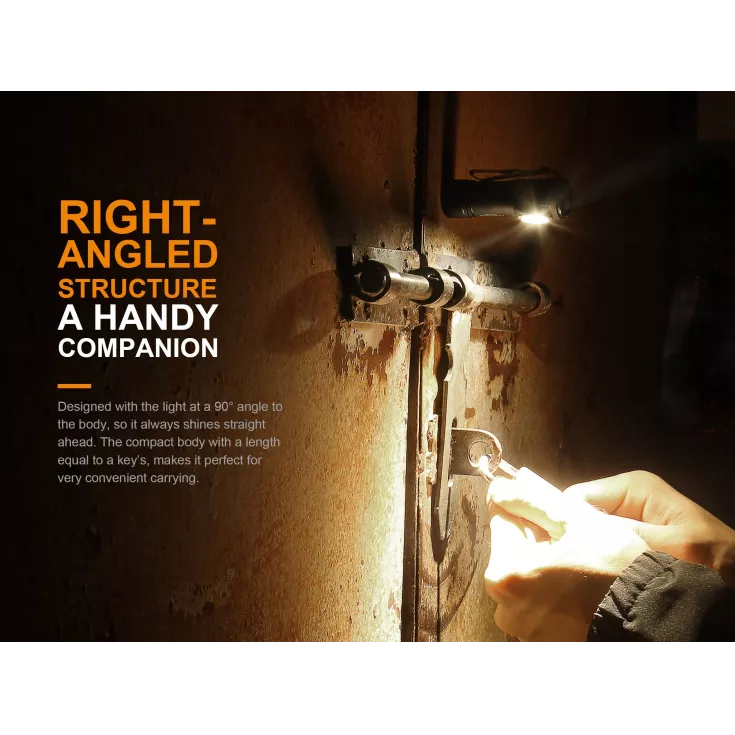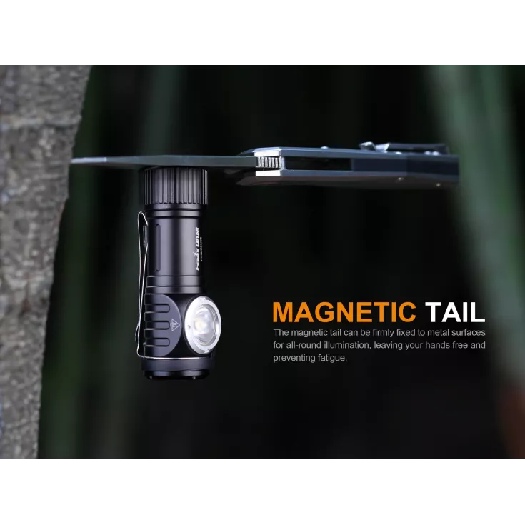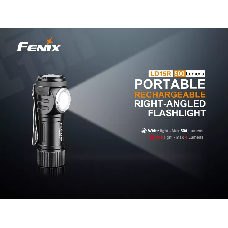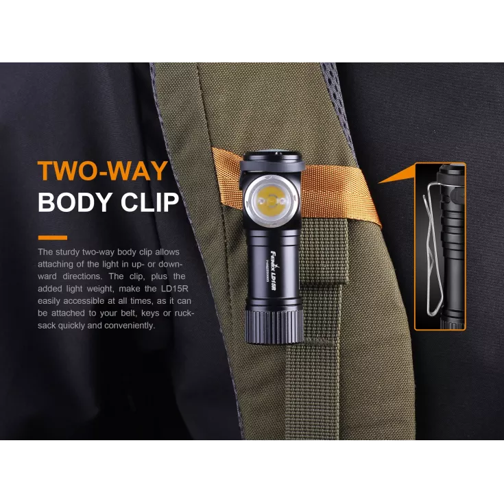 The flashlight features a right-angled beam with a dual output of red and white light. The base of the LD15R is magnetic which allows for attachment to metal surfaces, or use the included pocket clip to carry the light on your clothing or accessories.