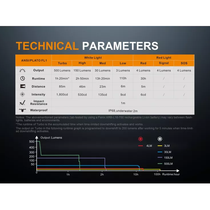 Turbo: 500 lumens – 1 hr 20 mins runtime