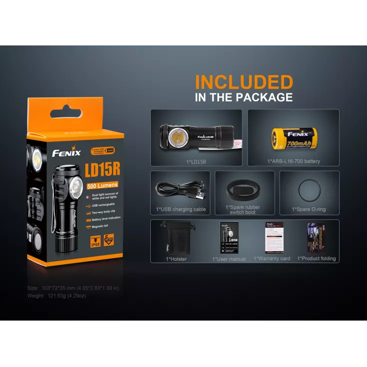 Includes: 1 x Fenix ARB-L16 700mAh RCR123A battery, USB charging cable, spare rubber boot switch, o-ring, holster.