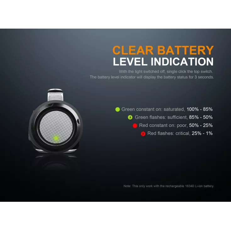 The LD15R is rechargeable via a micro USB port which allows for convenient charging when you are on the go. Please note, this feature can only be used when using a Li-ion RCR123A battery. The torch features a battery level indicator to ensure you know when it’s time to recharge.