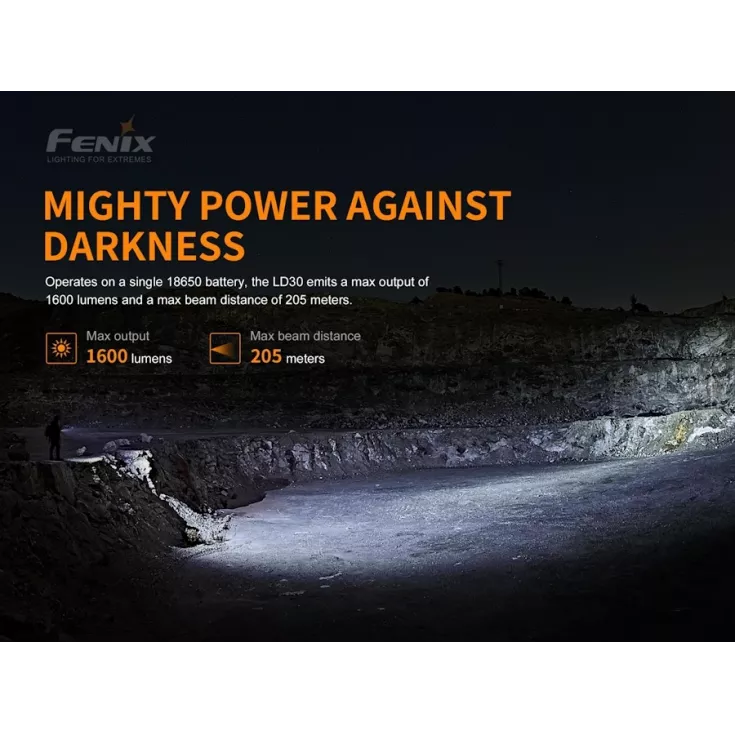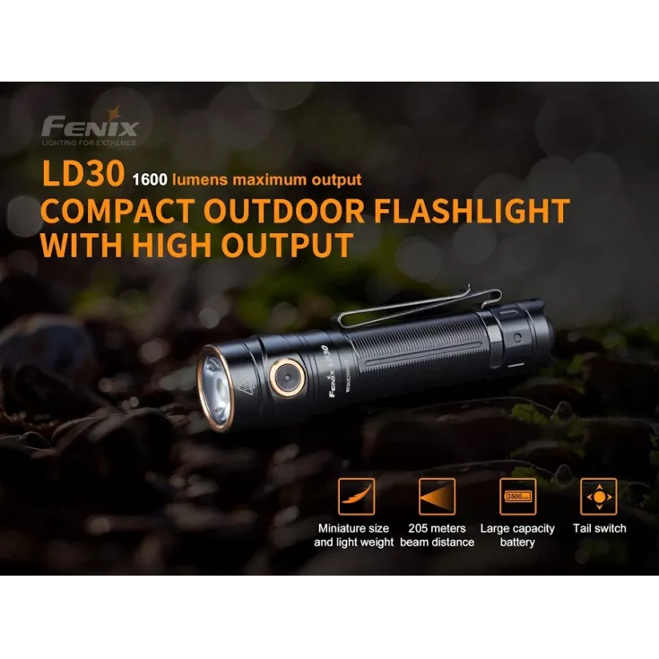 The Fenix LD30 flashlight has an impressive maximum output of 1600 lumens from the Luminus SST-40 LED and is powered by 1 x 18650 Li-ion battery. The light comes with a Fenix ARB-L18-3500U cell which features a built-in micro USB port, removing the need for a separate external charger.
