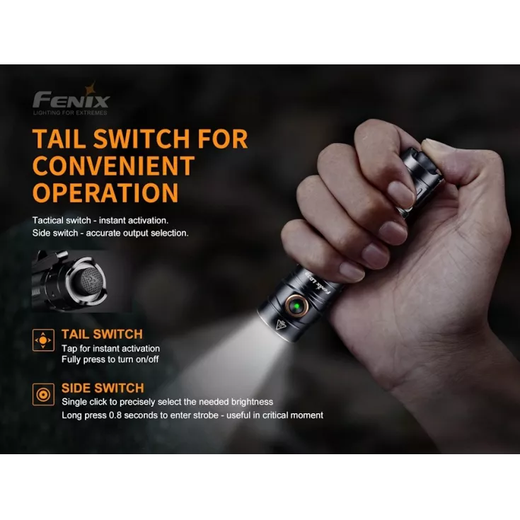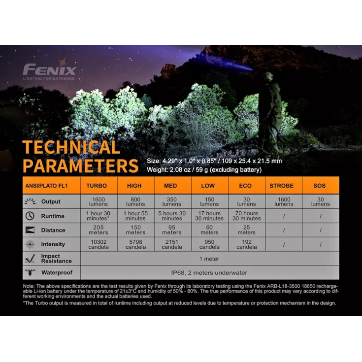 Includes: Fenix ARB-L18-3500U micro USB rechargeable Li-ion battery, USB charging cable, lanyard, holster, spare o-ring, pocket clip.