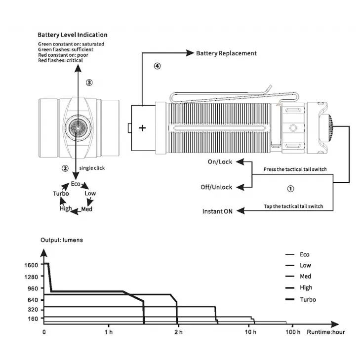 The torch is operated by a tail and side switch; the tail switch turning the light on and off while the side switch cycles through the outputs. The side button features a built-in battery indicator which shows green when the voltage is between 85% and 100%, flashes green when between 50% and 85%, shows red when between 25% and 50% and flashes red when between 1% and 25%.