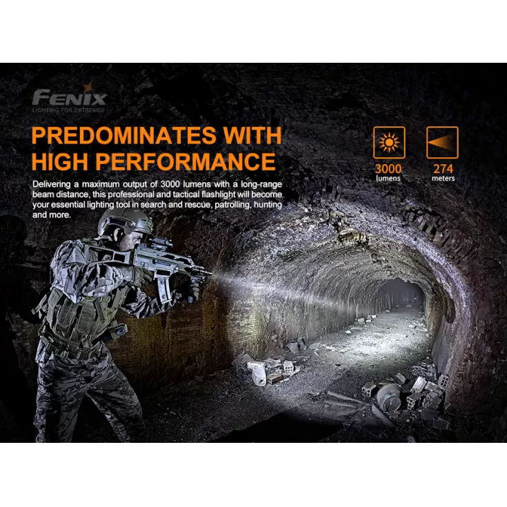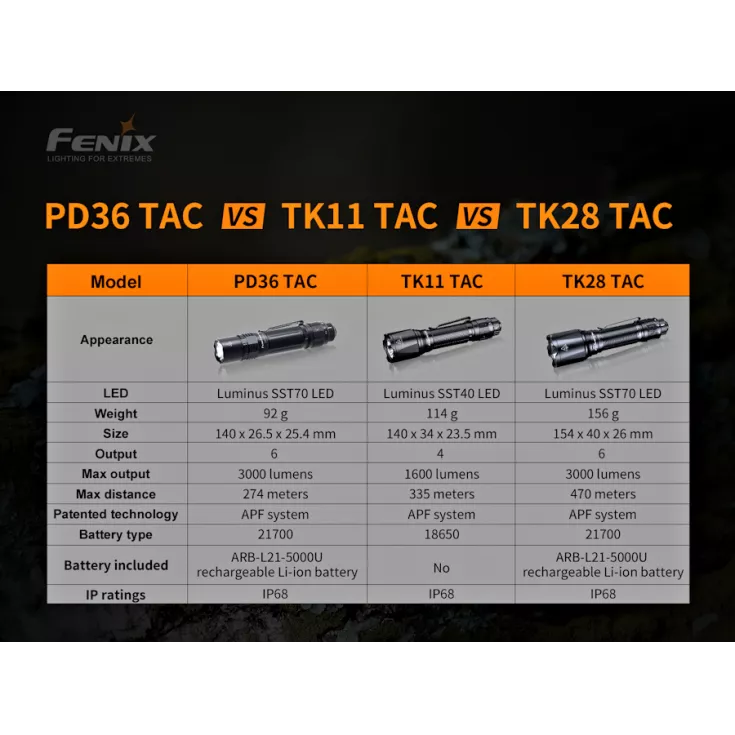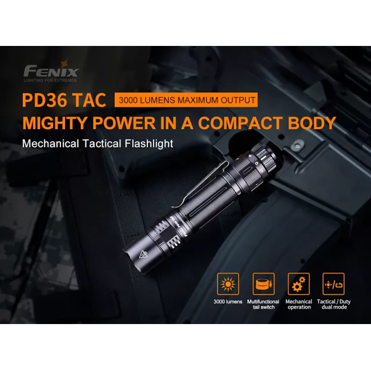 The Fenix PD36 TAC is a compact every day carry torch with an impressive maximum output of 3000 lumens from the Luminus SST70 LED, which has a long range beam distance of 274 meters.