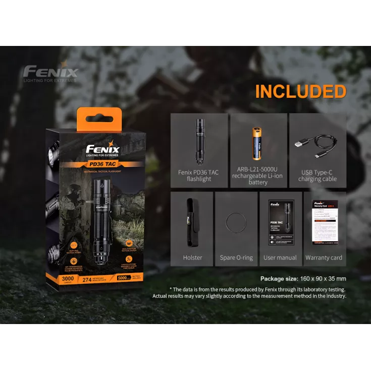 Fenix PD36 TAC Includes: Fenix ARB-L21-5000U USB-C rechargeable 21700 battery, USB type-C charging cable, nylon belt holster and spare o-ring.