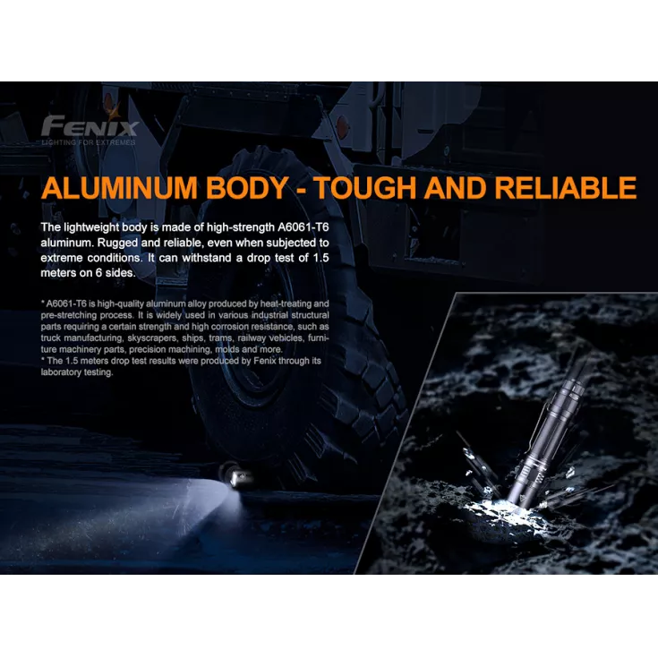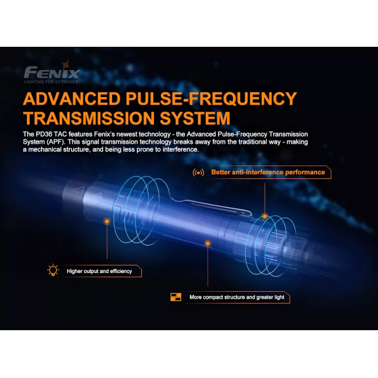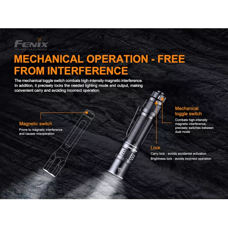 Operation of the PD36 TAC is via a tri-function tail switch, with near silent operation; tap on/off for output selection, full press for constant lighting and press and hold for strobe. The mechanical toggle switch combats high intensity magnetic interference and also features carry lock and brightness lock. Double springs at each end of the battery tube ensure reliable performance resisting impacts.
