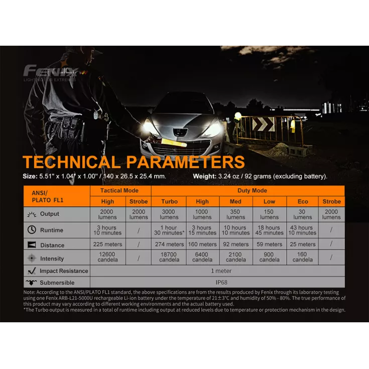 Turbo: 3000 lumens – 1 hour 30 minutes – 274 meters