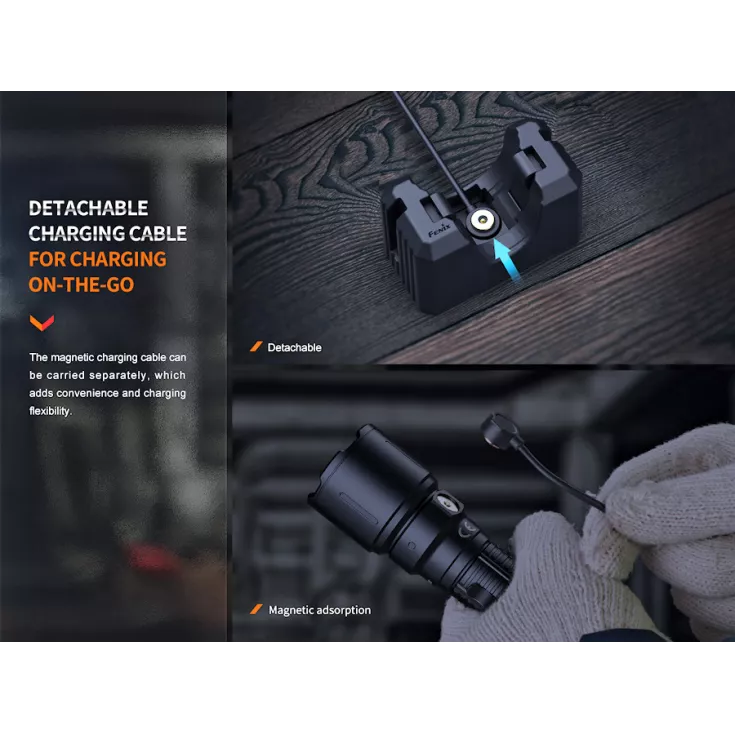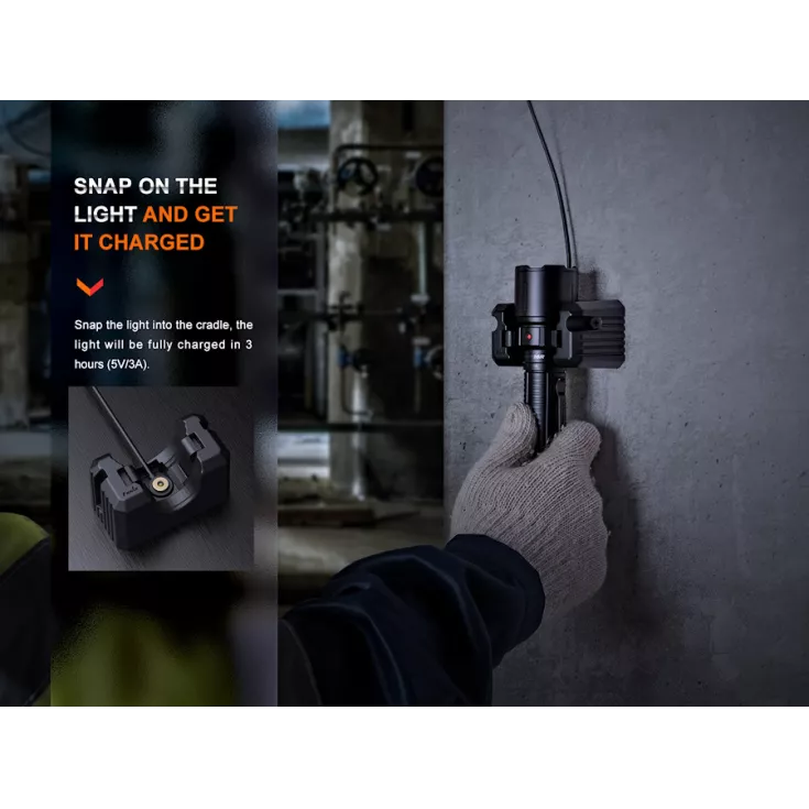 The Fenix WF26R rechargeable flashlight includes a magnetic charging cradle that can be wall mounted so the light is ready and charged when you need it most. The magnetic charging cable can also be easily removed from the cradle for charging on the go. A battery status light on the side of the amount of charge remaining.
