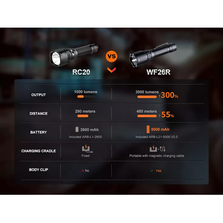 Featuring a Luminus SST70 LED with a lifespan of 50,000 hours and a range of up to 450 meters, the WF26R is a good all-round torch, suitable for a wide range of applications.
