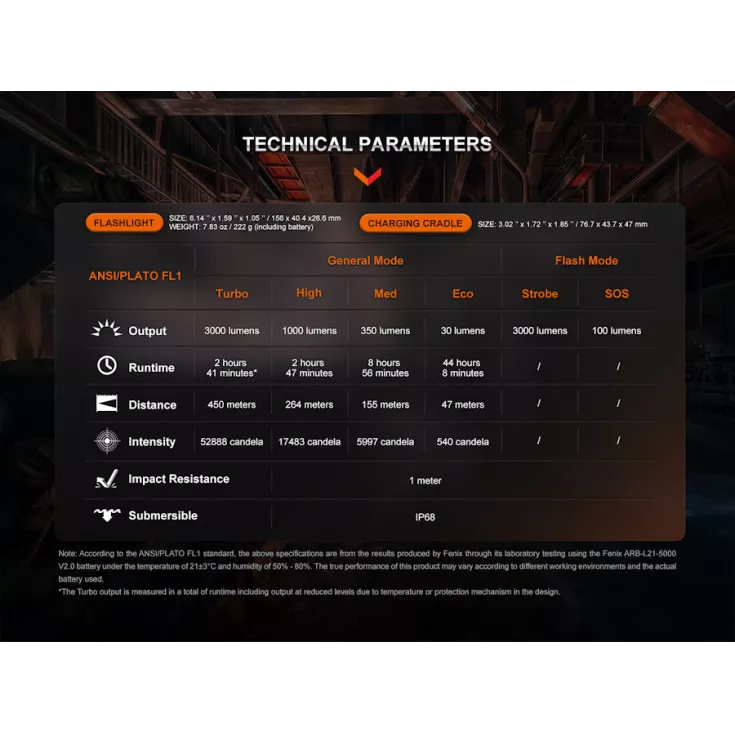 Turbo: 3000 Lumens – 2 hours 41 minutes* – 450 meters