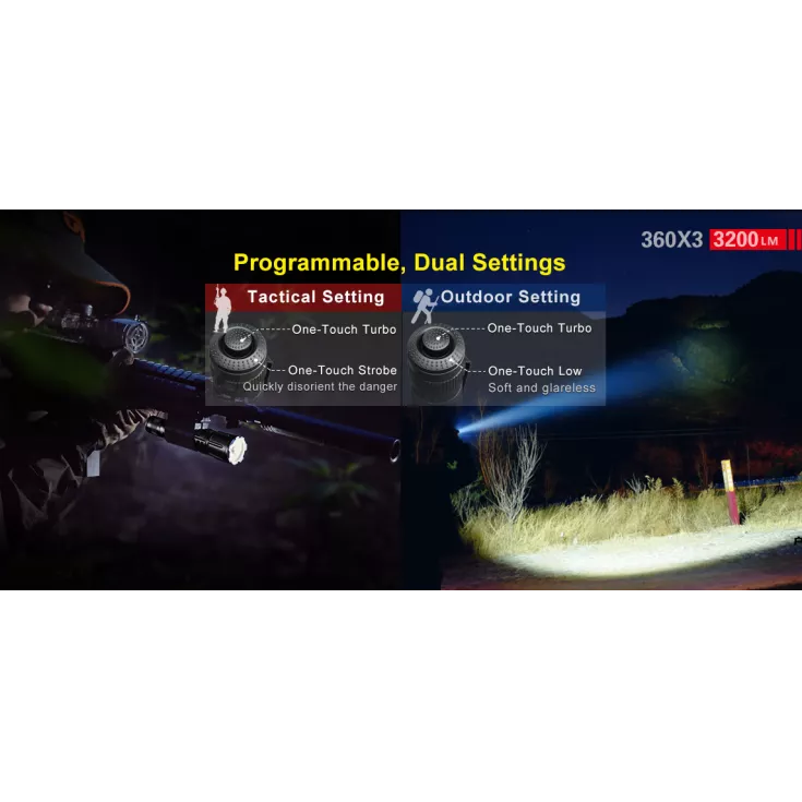 The Klarus 360X3 torch has a maximum output of 3200 lumens from the Cree XHP70.2 P2 LED and is powered by 1 x rechargeable Li-ion 18650 (included) or 2 x CR123 single use or RCR123 Li-ion batteries.