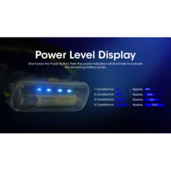 The flashlight has a battery capacity indicator built in to the side switch which ensures you know when to recharge or change your cells. The indicator will show green when the capacity is over 70%, orange when it’s between 30% and 70%, red when it’s less than 30% or flash red when it’s less than 10%.