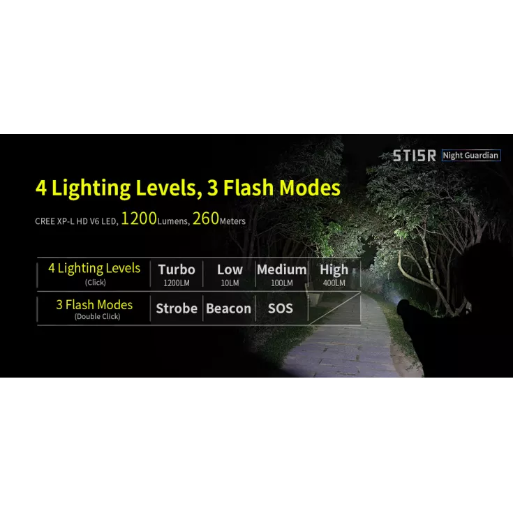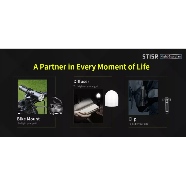 Nicknamed the ‘Night Guardian’, the ST15R offers a range of accessories to make it the ideal light for your application, whether it’s cycling and using the included bike mount, camping and using the diffuser or outdoor activities such as hiking and using the pocket clipc to attach the light to your gear.