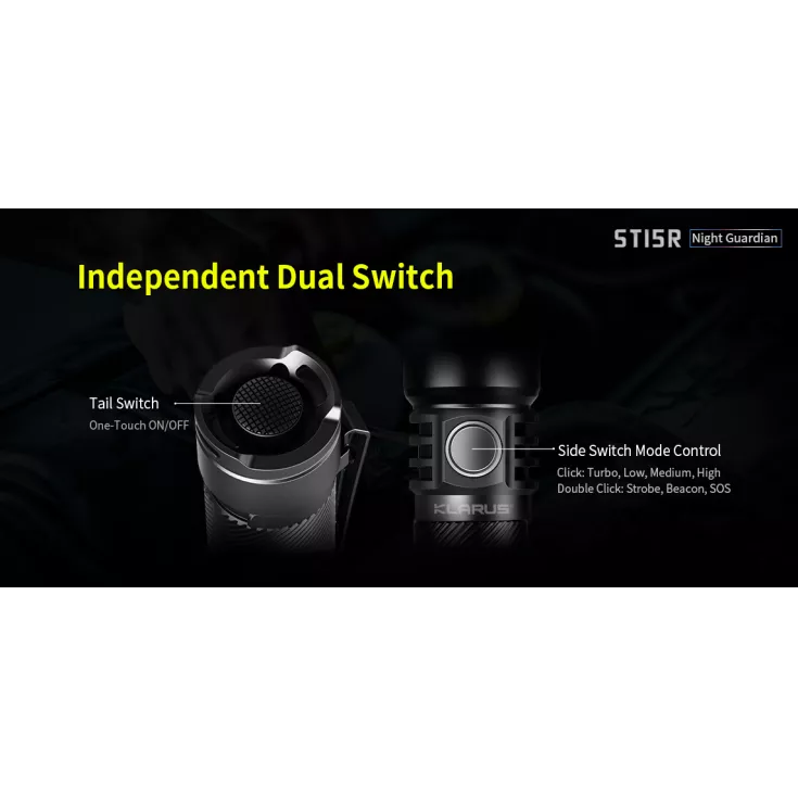 The Klarus ST15R has four brightness levels ranging from 10 to 1200 lumens, plus strobe, beacon and SOS modes for emergency use. The flashlight features a dual switch user interface, made up of the tail switch to turn the light on and off and the side switch which cycles through the modes.