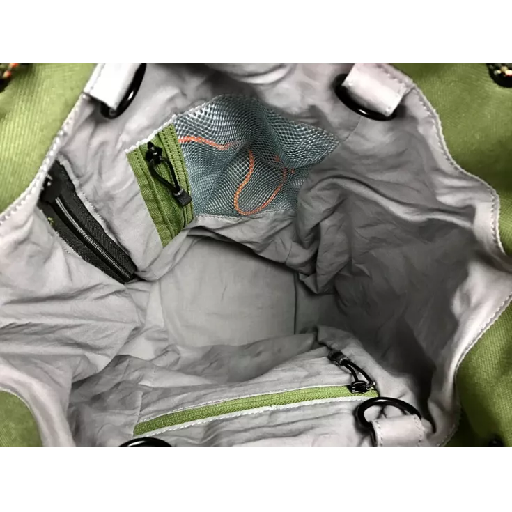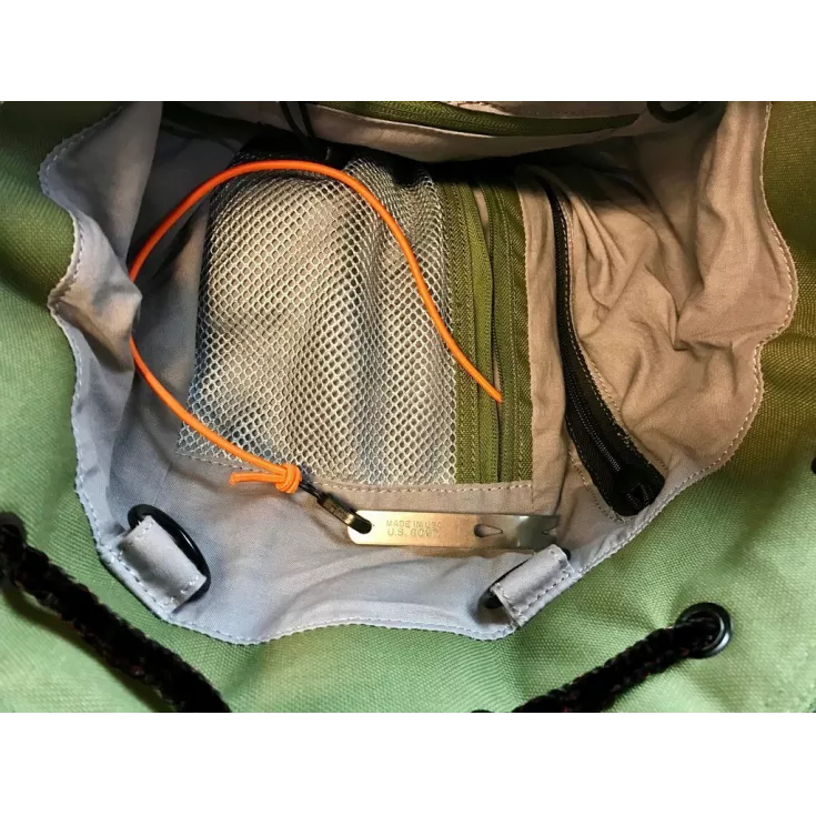 The interior of the Maratac daypack is made from grey cotton and features two inner pockets, one of which is made from see-through mesh with an orange key tether.